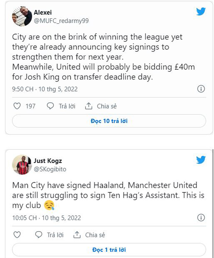 Một fan nam khác của “Quỷ đỏ” có tài khoản Just Kogz thì viết dòng bày tỏ trạng thái trên Twitter kèm biểu tượng mặt khóc: “Man City đã chiêu mộ Haaland, Man United thì vẫn đang gặp khó khăn trong việc tìm trợ lý cho tân HLV Ten Hag. Đây là CLB của tôi đấy”.