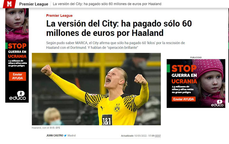 Trong khi đó, tờ Marca (Tây Ban Nha) khẳng định Man City đã có một “món hời” lớn khi nhà báo John Castro cho biết, đội chủ sân Etihad khẳng định họ chỉ phải trả 60 triệu euro (không bao gồm phụ phí) thay vì 75 triệu euro để giải phóng hợp đồng của Haaland với Dortmund.
