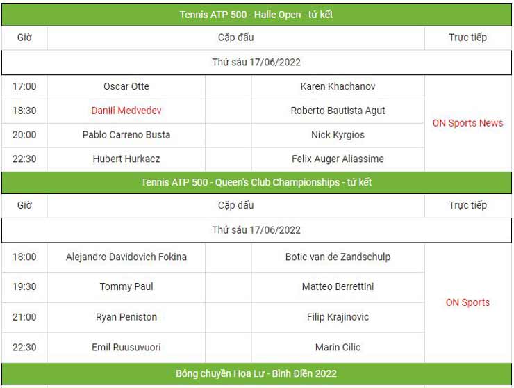 3 trận tứ kết còn lại của nội dung đơn nam giải ATP 500 sân cỏ Queen's Club Championships hôm nay (17/6) cũng sẽ diễn ra. Vào lúc 18h, Alejandro Davidivich Fokina (Tây Ban Nha) sẽ gặp Botic van de Zandschulp. Sau đó, vào khoảng 21h, Ryan Peniston (Vương quốc Anh) chạm trán Filip Krajinovic (Serbia). Tiếp đến, dự kiến khoảng 22h30 cùng ngày, Emil Ruusuvuori (Phần Lan) sẽ đối đầu hạt giống số 7 Marin Cilic (Croatia).