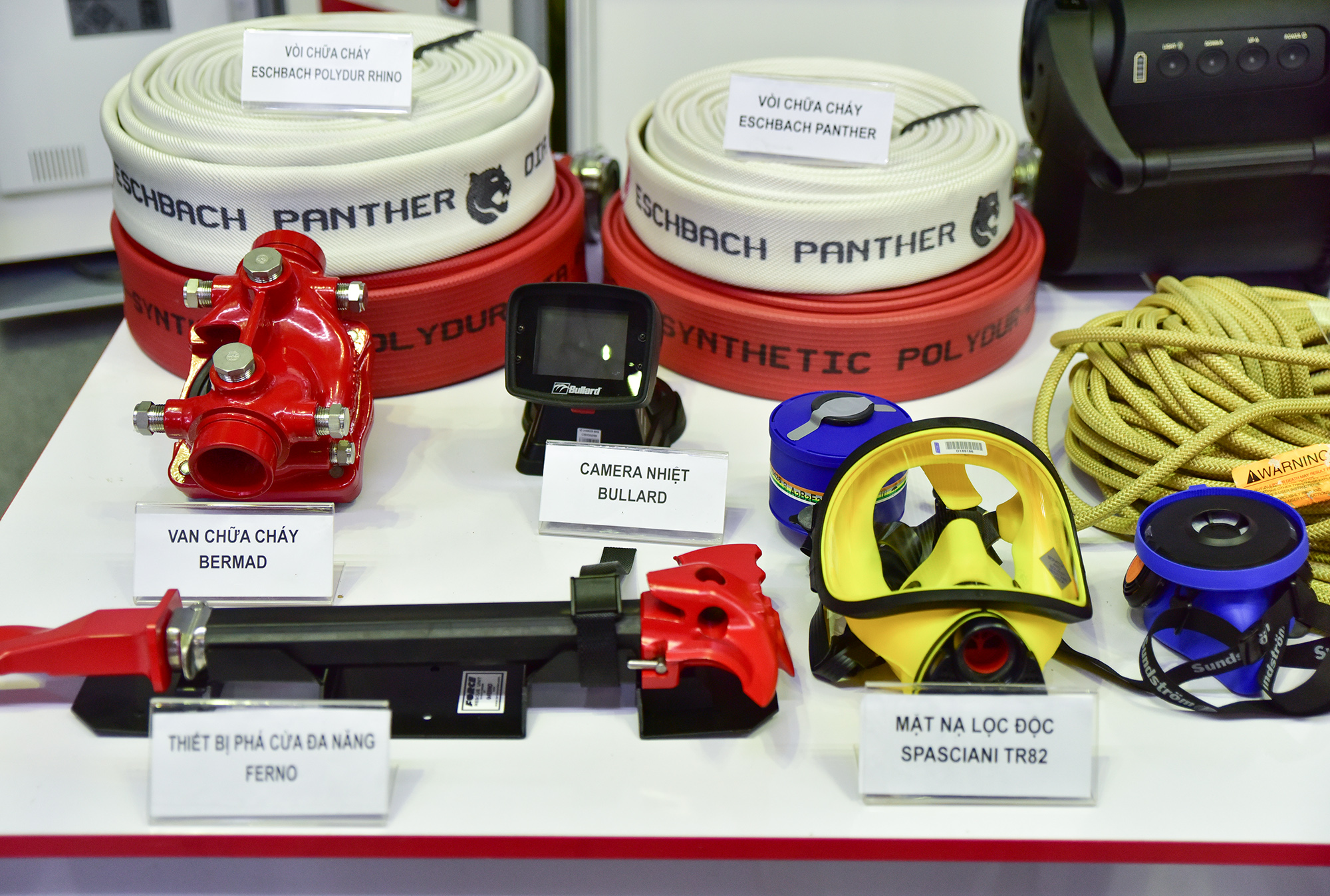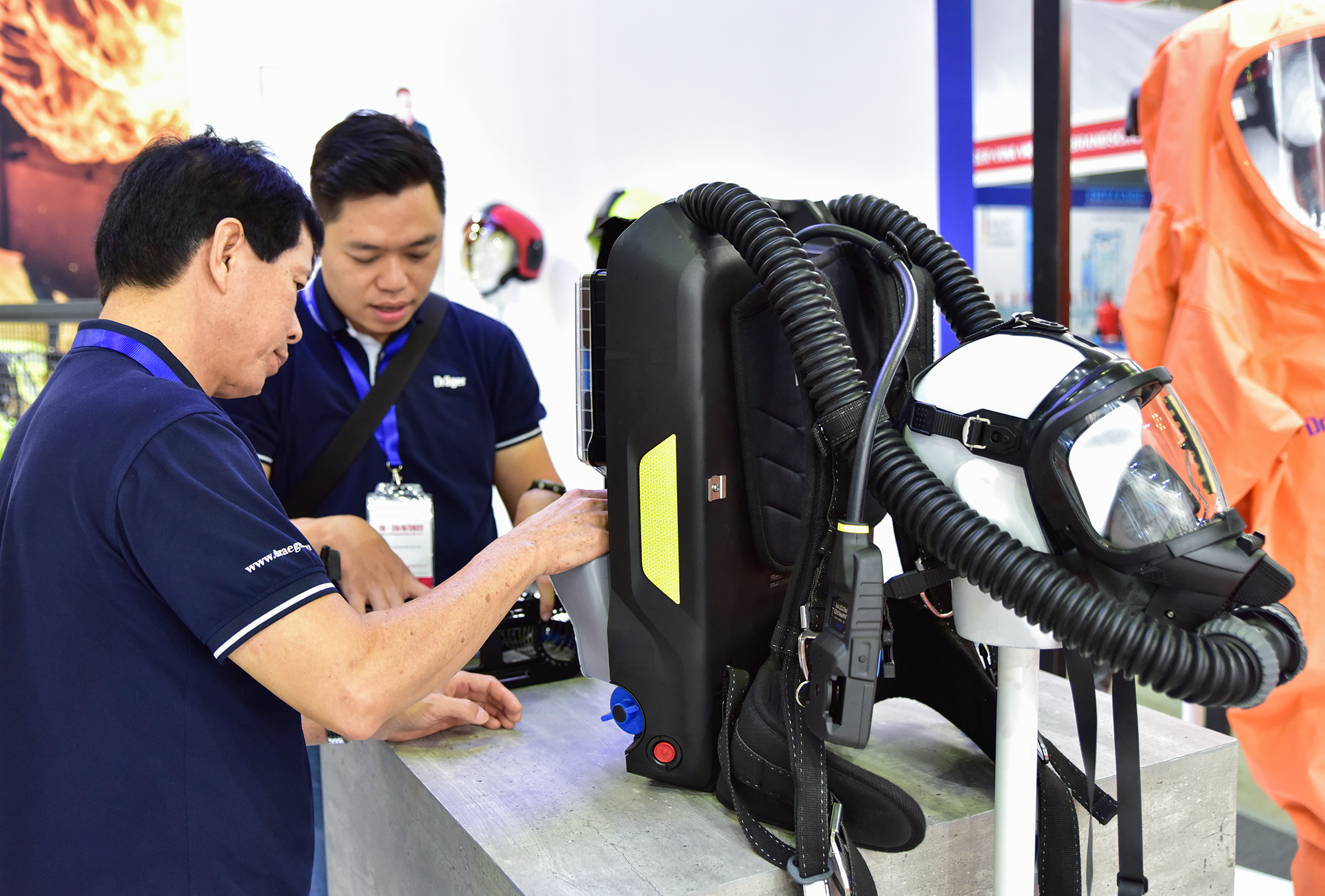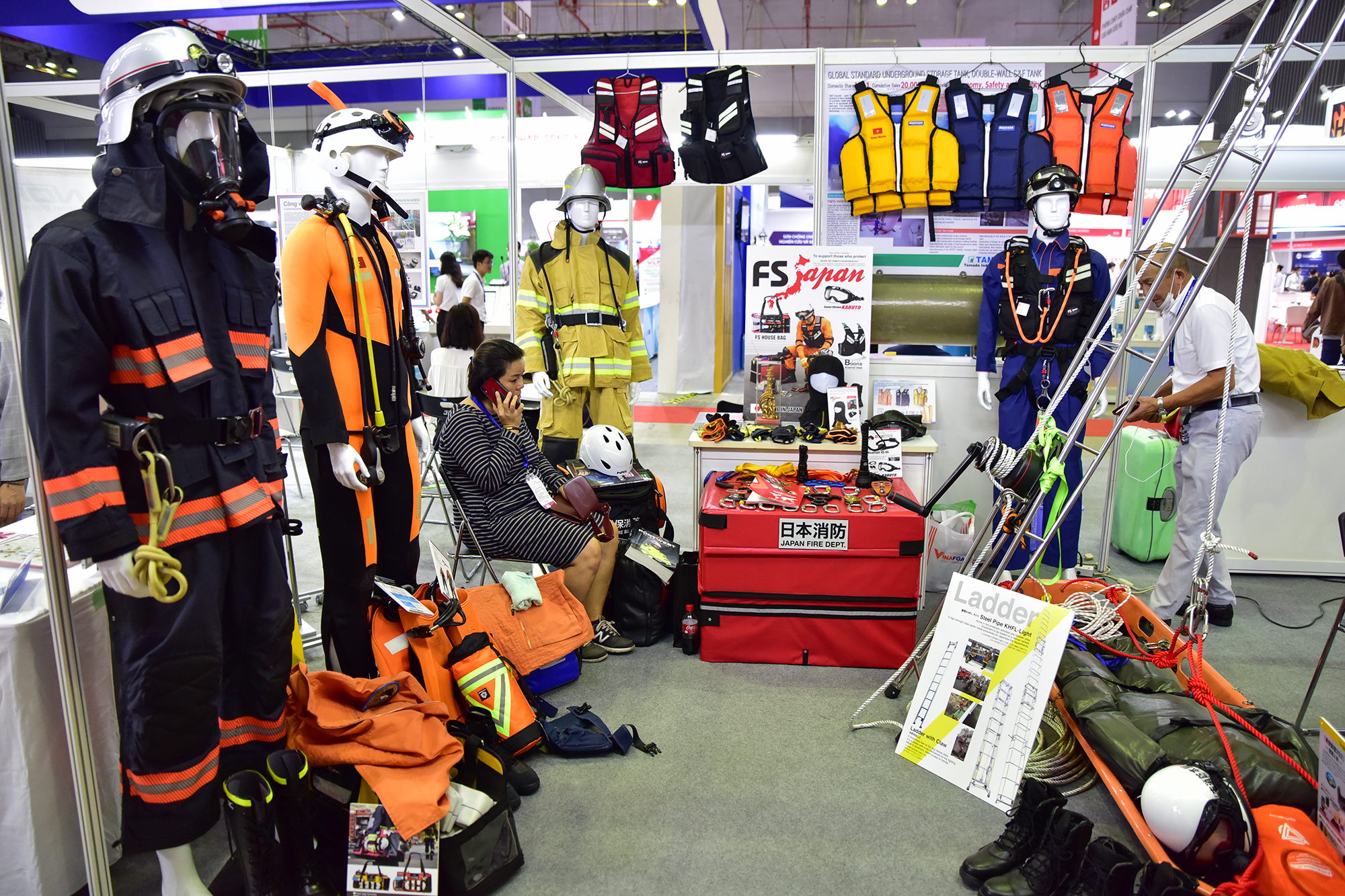 Các đơn vị trong và ngoài nước giới thiệu hàng loạt thiết bị, đồ bảo hộ, cứu nạn dùng cho các doanh nghiệp, nhà xưởng, khu dân cư đến các gia đình như áo quần, thang cứu hộ, thang dây…