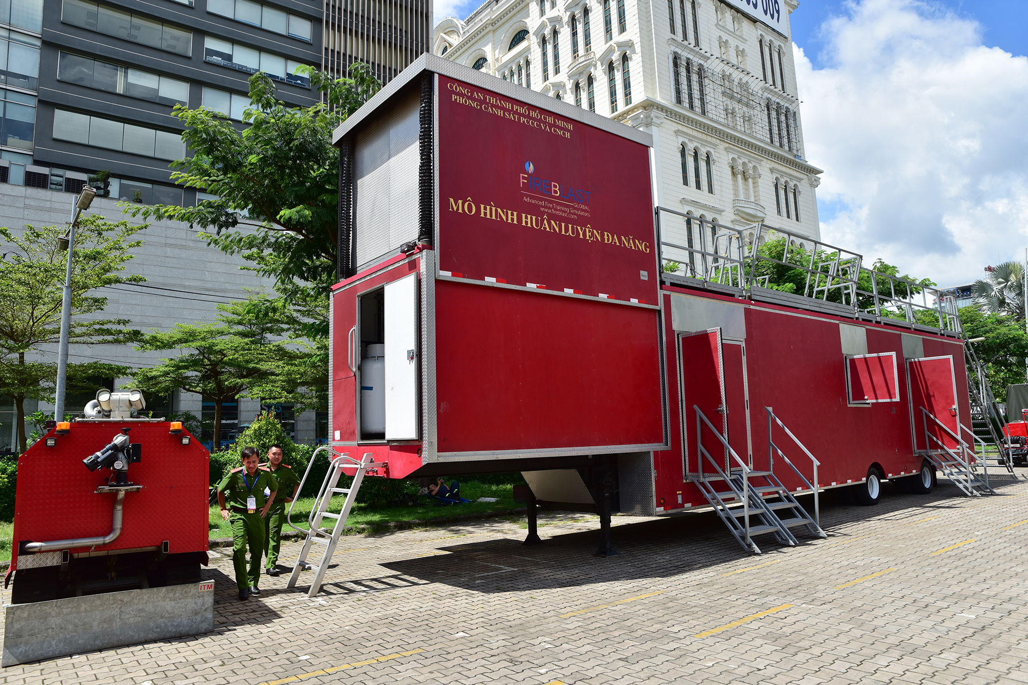 Công an TP.HCM giới thiệu mô hình huấn luyện đa năng, phục vụ việc tập luyện của cảnh sát PCCC. Mô hình cao khoảng 8 m, làm bằng sắt thép, được thiết kế như một ngôi nhà di động, có bánh xe để dễ dàng di chuyển.