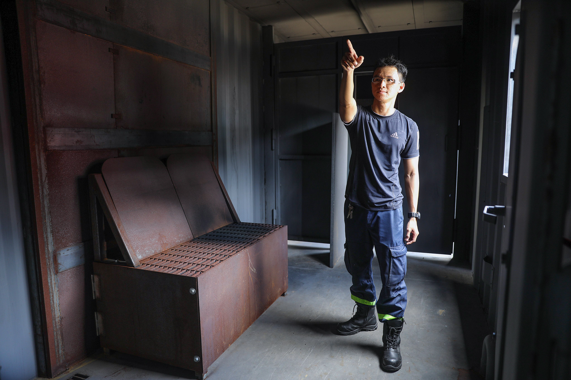 Bên trong mô hình bài trí nội thất như căn nhà với đủ phòng khách, bếp, cửa ra vào, bàn ghế, cầu thang... đều làm bằng sắt. "Mô hình có hệ thống khí gas sẽ kích hoạt ra lửa để cảnh sát cứu hoả tập các bài tập ứng phó với trường hợp nhà, căn hộ, văn phòng... bị cháy. Vì vậy mô hình với thiết kế như vậy sẽ rất thiết thực trong tập luyện cứu hộ, cứu nạn", anh Nguyễn Thanh Lâm (30 tuổi, Phòng Cảnh sát PCCC và Cứu nạn cứu hộ TP HCM) cho biết.