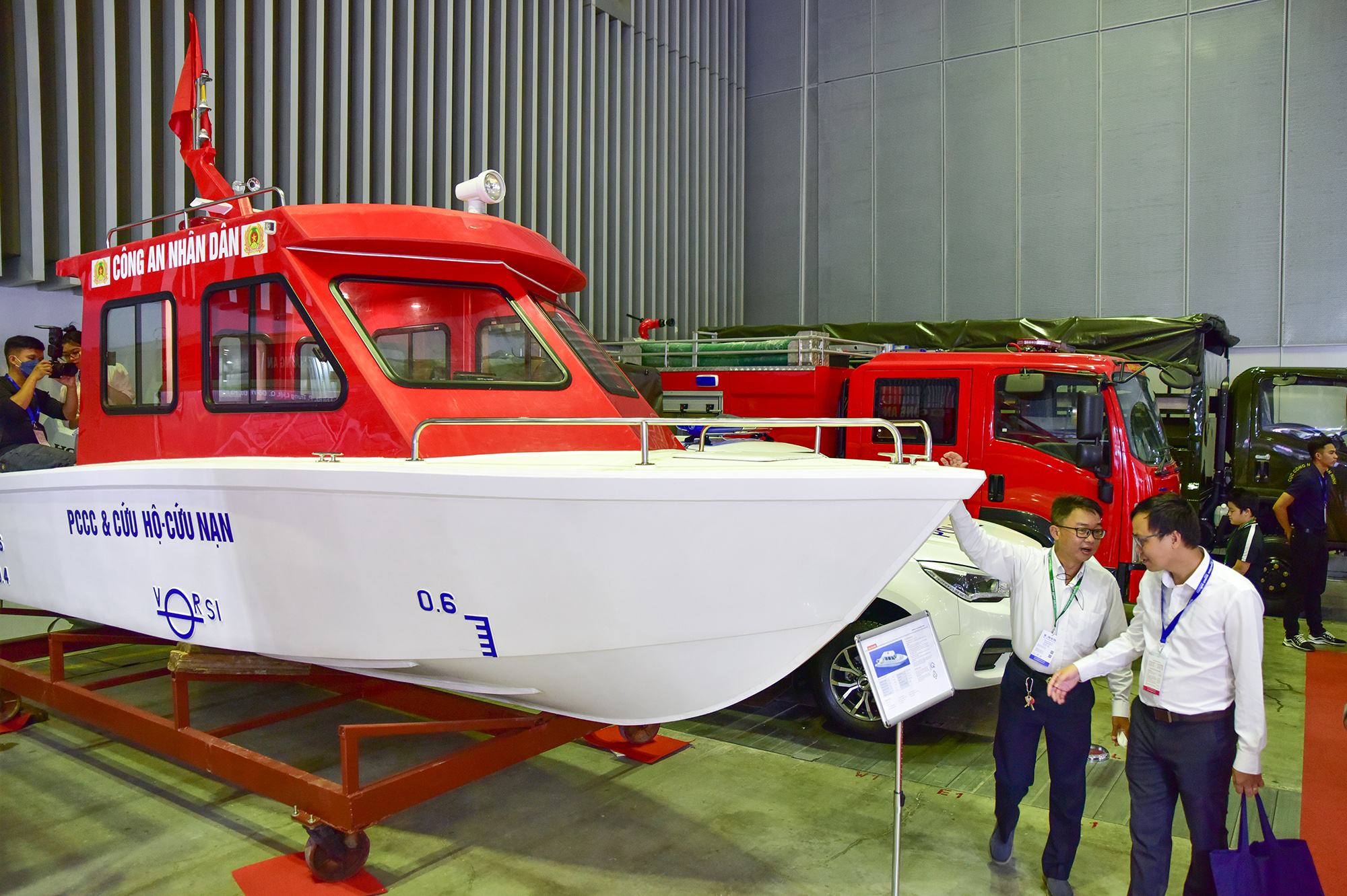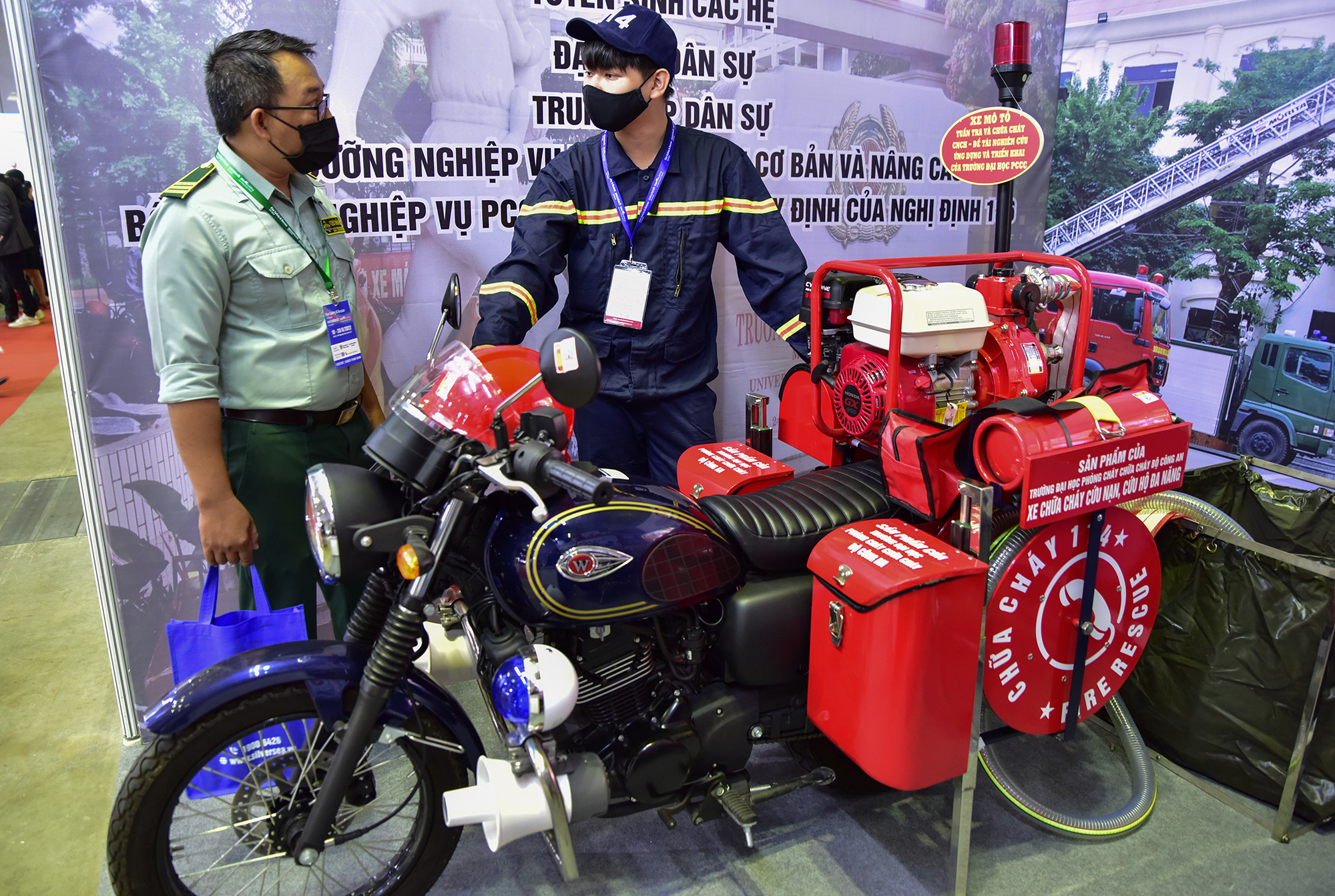 Trường Đại học Phòng cháy Chữa cháy trưng bày xe môtô tuần tra và chữa cháy cứu nạn cứu hộ tại triển lãm. Học viên Lê Minh Khang cho biết đây là đề tài nghiên cứu ứng dụng và triển khai của trường xe dùng luồn lách vào trong các hẻm nhỏ để chữa cháy với các thiết bị đi kèm như máy bơm, máy phát điện, vòi nước, bình cứu hoả, đồ cứu nạn cứu hộ…Xe có thể lấy nước từ trong nhà dân với một người điều khiển.