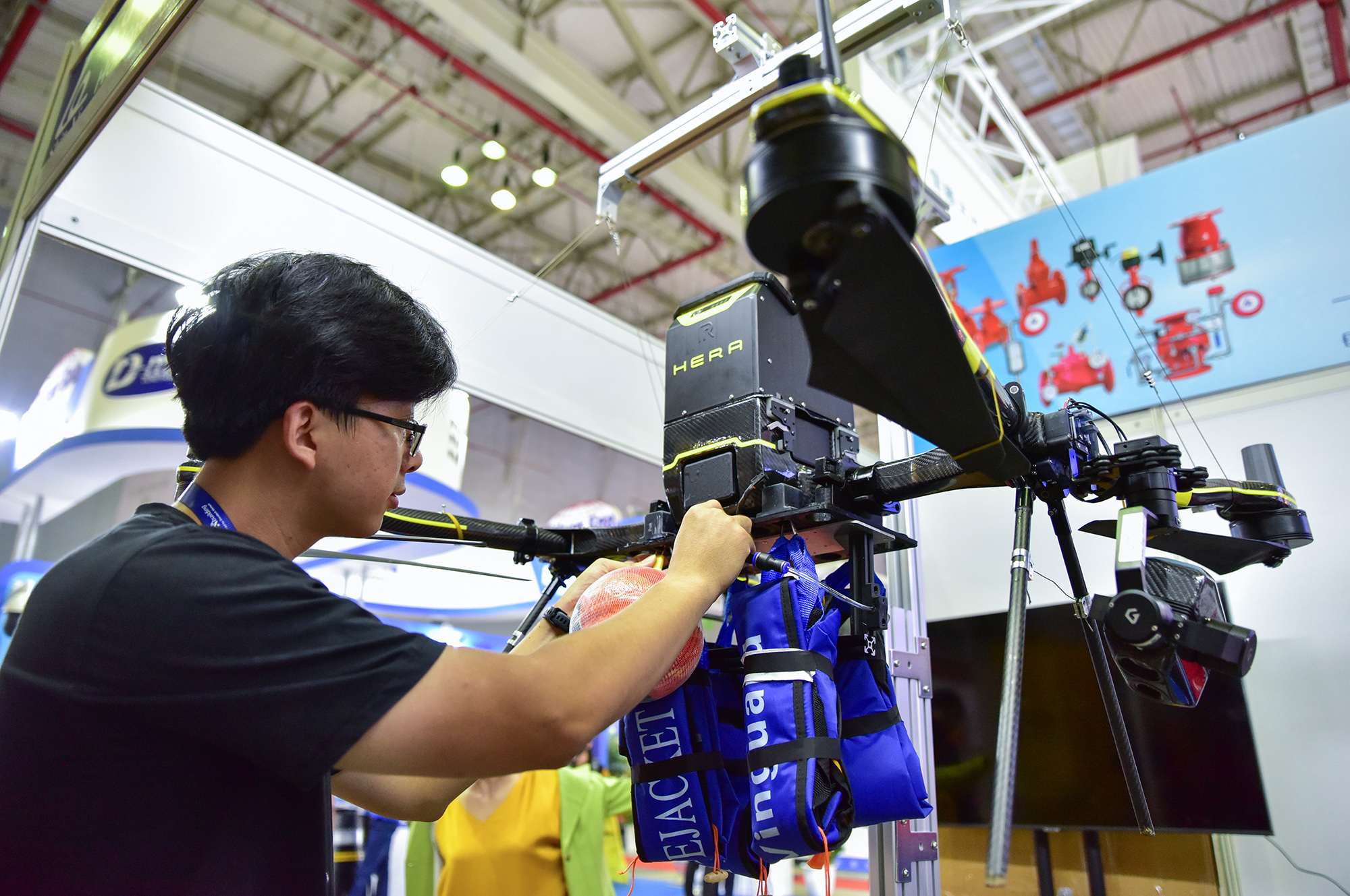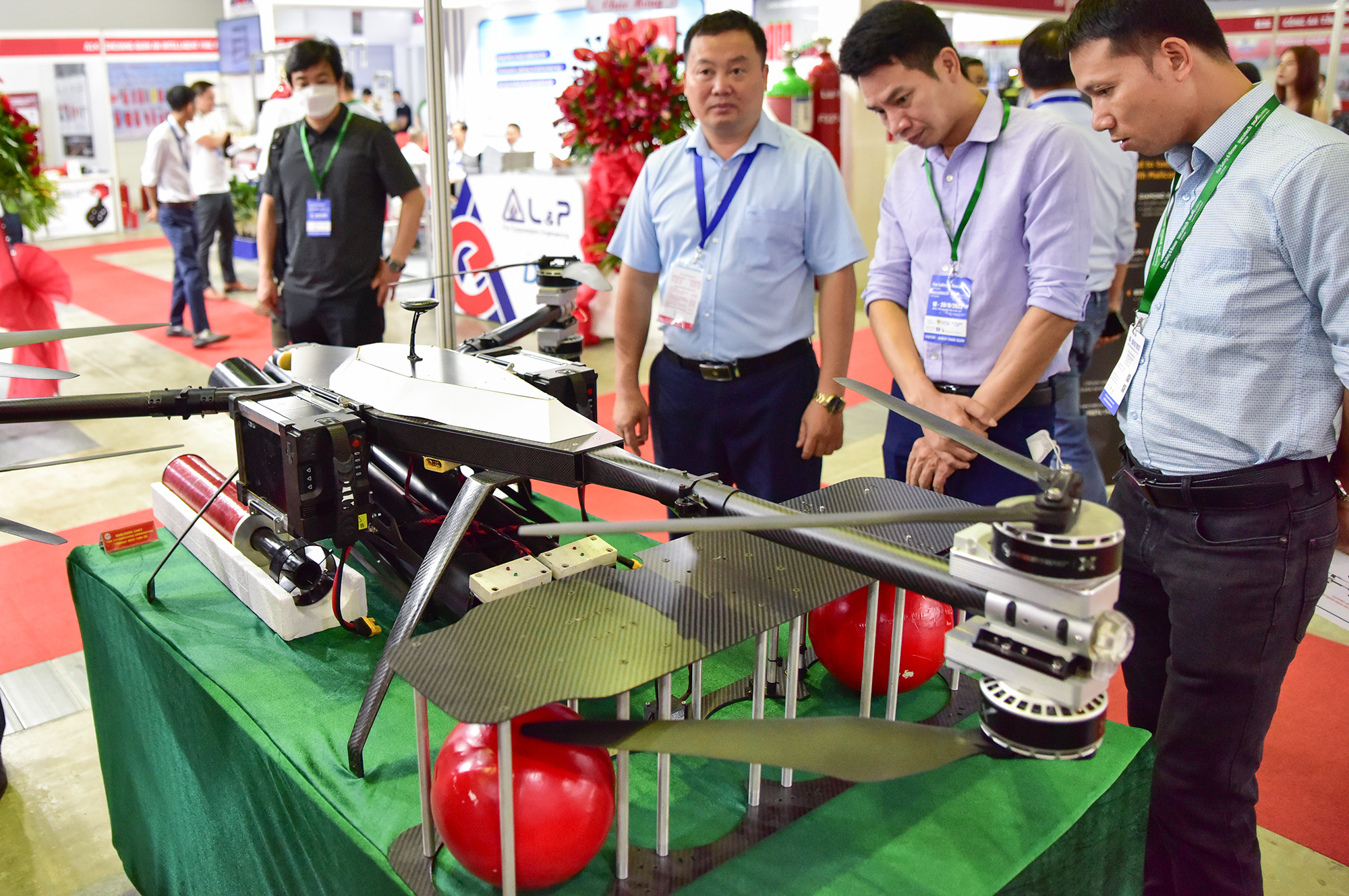 Tại triển lãm, các đơn vị trưng bày nhiều sản phẩm PCCC và cứu nạn cứu hộ hiện đại, công nghệ cao thuộc các dòng thiết bị như xe, robot, thiết bị bay không người lái, dàn phóng chữa cháy. Trong ảnh, thiết bị bay điều khiển từ xa có tải trọng 15kg, trần bay 500m, được lắp 3 camera, hỗ trợ thả phao cứu hộ và gắn quả cầu chữa cháy.