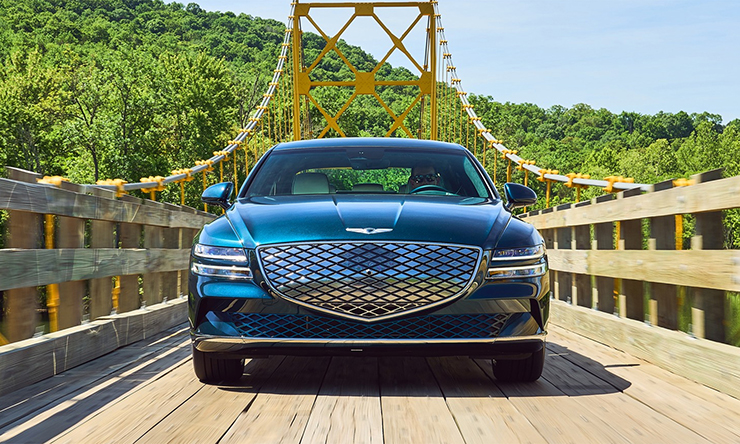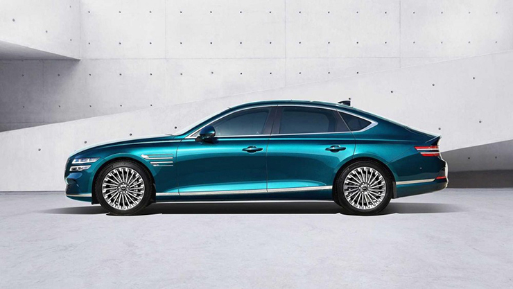 Điểm nhấn ngoại thất của G80 EV nằm ở kiểu lưới tản nhiệt kín như bưng và cũng là nơi có cổng sạc được giấu khéo léo. Mẫu sedan chạy điện còn có hệ thống đèn LED, cửa đóng điện, và cốp sau mở tự động rảnh tay. Xe trang bị bộ vành hợp kim 19 inch, gạt mưa cảm biến, và gương gập chỉnh điện có thể phát sáng logo Genesis lên mặt đất.
