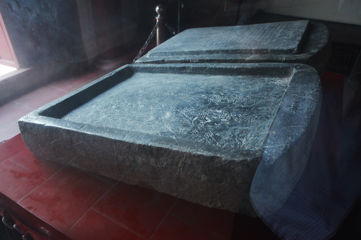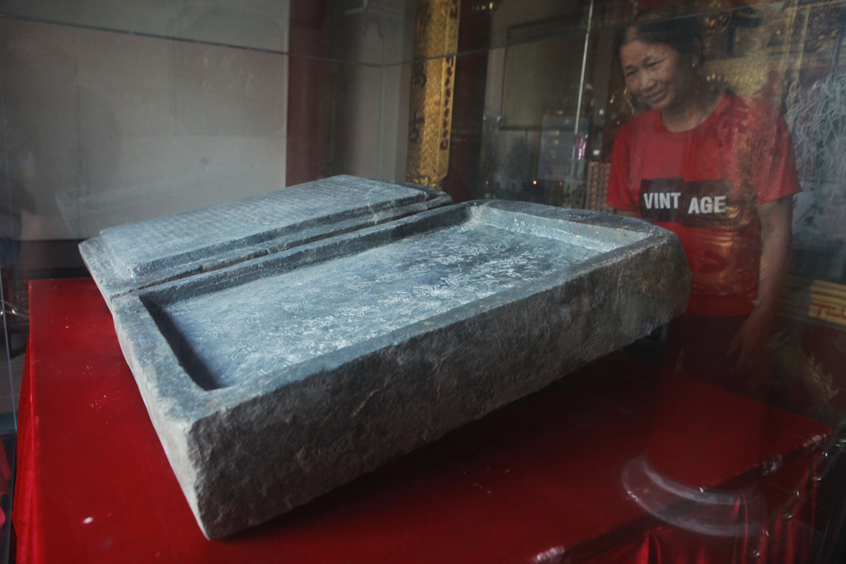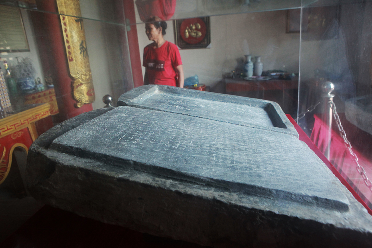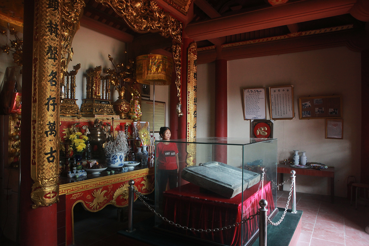 Bia đá hình hộp được bảo quản trong tủ kính cường lực, đai kim loại trang trí, đặt trang trọng giữa đền. Mùng một, ngày rằm hằng tháng, Hội Người cao tuổi thôn và bà con đến thắp hương tưởng nhớ các bậc tiền nhân.