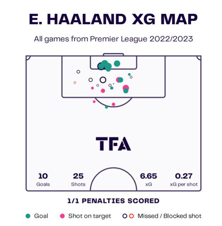 Sơ đồ cho thấy các bàn thắng của Erling Haaland ở Premier League mùa này cho Man City chủ yếu tập trung trong vòng cấm của đối thủ (chấm xanh: bàn thắng; chấm hồng: sút trúng khung thành; chấm trắng hoặc cam: sút trượt khung thành hoặc bị cản phá)