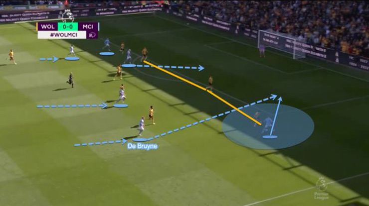 Bên cạnh đó, vai trò “nhạc trưởng” của Kevin De Bruyne rất rõ nét khi tiền vệ người Bỉ thường xuyên chuyền bóng kiến tạo cho Haaland và các đồng đội khác ghi bàn mùa này. Cựu cầu thủ Wolfsburg có xu hướng chuyền bóng ở khoảng trống giữa các trung vệ đối thủ, hoặc khi cần, anh có thể dâng cao dứt điểm hoặc câu bóng cho đồng đội tìm kiếm cơ hội.