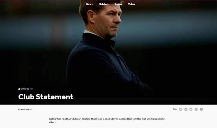 Thông báo sa thải rất ngắn gọn chỉ vỏn vẹn hai dòng: “CLB Aston Villa xác nhận HLV trưởng Steven Gerrard rời vị trí của mình ngay lập tức". Một thành viên trong ban lãnh đạo nói: “Chúng tôi xin cảm ơn Steven vì những đóng góp của ông cho CLB và xin gửi lời chúc tốt đẹp nhất”.
