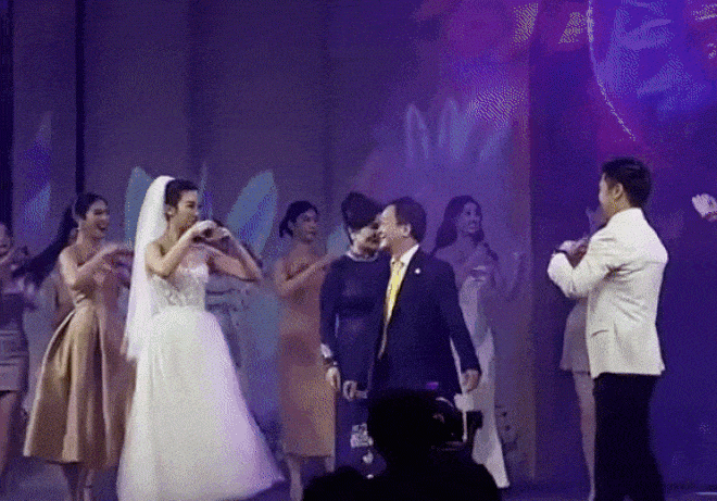 Đáng chú ý, sau nghi thức làm lễ, “Hoa hậu Việt Nam 2016” và chồng tỷ phú đã cùng nhảy trên nền nhạc mashup “Tình đã đầy một tim - Lưu số em đi”. Đặc biệt, sự xuất hiện của ông Đỗ Quang Hiển (hay còn gọi là Bầu Hiển) và bà xã đã khiến tất cả mọi người bất ngờ. Nam doanh nhân đứng giữa cô dâu chú rể và dàn người đẹp Hoa hậu, vui vẻ nhảy nhiệt tình. Dù “chưa thuộc bài” và nhảy theo những người khác, nhưng Bầu Hiển vẫn khiến quan khách rất phấn khích.