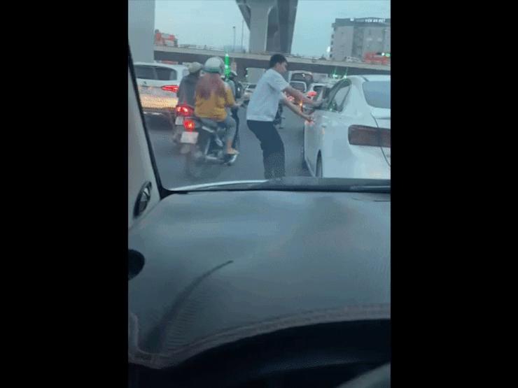 Không biết có xích mích gì mà người đàn ông yêu cầu tài xế xuống xe không được thì bất ngờ nhảy lên nắp capo để chặn xe ô tô không cho di chuyển.