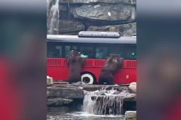 Hành khách dường như không thấy sợ hãi khi những chú gấu đen bám quanh xe ô tô.