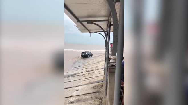 Hình ảnh ghi lại chiếc ô tô do người đàn ông điều khiển đang di chuyển trên kè bờ biển. Và may mắn cho cả người lẫn xe khi thanh niên này điều khiển ô tô thoát nạn trong thời khắc "sinh tử".