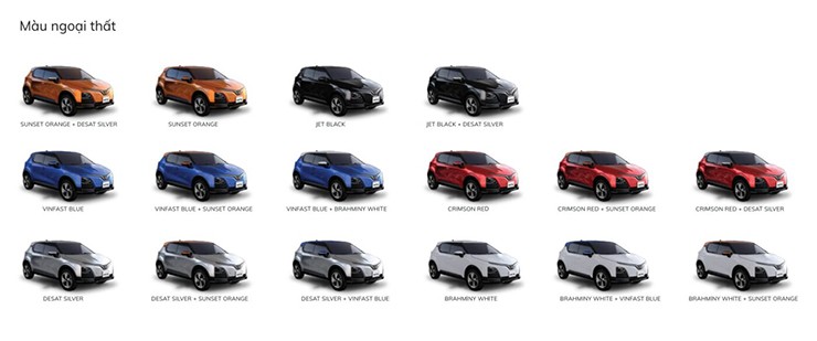 VinFast VF 5 sở hữu 16 màu lựa chọn màu ngoại thất, trong đó có 10 mẫu sơn ngoại thất hai tông màu. Nội thất xe cũng có 3 tùy chọn là đen, đen pha xanh, đen pha cam.
