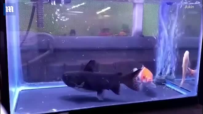 Con cá mèo miệng rộng nuốt chửng một con cá khác to gần bằng nó trong bể kính ở Indonesia.