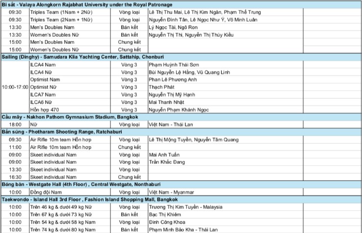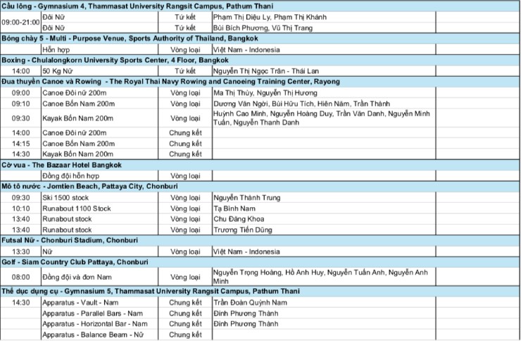 (Tin thể thao, tin SEA Games) Ngày 12/12, thể thao Việt Nam bước vào chặng đấu căng thẳng với nhiều VĐV chủ lực tranh tài, mở ra cơ hội giành huy chương ở bơi, điền kinh, võ thuật và các môn đồng đội.