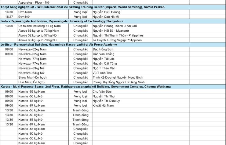 Các môn võ thuật tiếp tục là điểm tựa, với judo, ju-jitsu và karate có nhiều trận chung kết, trong đó các VĐV như Thanh Thủy, Đặng Đình Tùng hay các kumite Việt Nam hướng tới vàng. Thể dục dụng cụ đặt trọng tâm vào Đinh Phương Thành và Quỳnh Nam tranh chấp xà đơn, xà kép, nhảy chống.