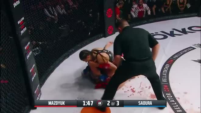 Khác hẳn với trận đấu knock-out nam võ sĩ to béo, Mazdyuk trận này không thể hiện được quá nhiều. Những cú đấm, cú đá của cô tỏ ra thiếu lực, trong khi Sadura nhanh nhẹn và có đòn tấn công lợi hại hơn. "Nữ hoàng đỏ" đuối sức trong hiệp 2, bị Sadura đè ra sàn rồi đấm không thương tiếc và trọng tài buộc phải can thiệp.