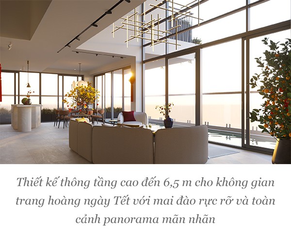 Chính độ cao và độ rộng ấy khiến việc trang hoàng Tết trở nên thoải mái và có chiều sâu hơn. Một cành mai lớn, một cây đào cao được đặt giữa phòng khách mà không làm không gian nặng nề. Câu đối, bình hoa, mâm ngũ quả hay những chi tiết trang trí truyền thống đều có “đất” để hiện diện đúng tỷ lệ, không bị gò bó. Tết trong căn Penthouse không phải là sự bày biện, mà là sự hòa quyện giữa kiến trúc và không khí mùa xuân.