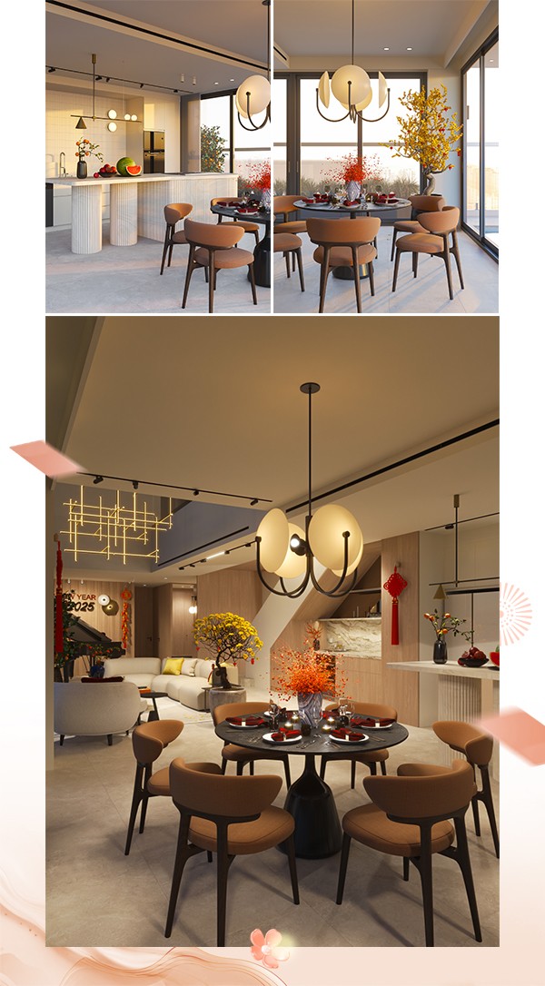 Buổi sáng đầu năm, ánh nắng đi vào nhà từ độ cao thông tầng, lan dần xuống không gian sinh hoạt và khu vực bàn ăn. Ban công rộng mở mang theo gió xuân và khoảng trời thoáng đãng, nơi sắc mai, sắc đào hòa cùng ánh sáng tự nhiên. Không cần trang hoàng cầu kỳ, bởi chính chiều cao trần, ánh sáng và độ thoáng đã tạo nên phong vị Tết rất riêng.