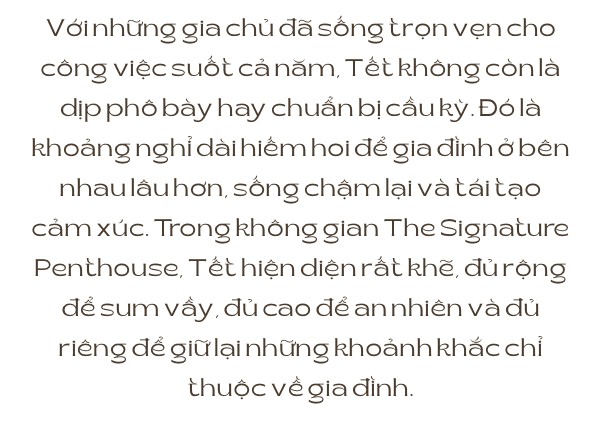 Ở The Signature Penthouse, sự chậm lại không mang cảm giác rút lui. Đó là một khoảng nghỉ đúng nghĩa, nơi gia đình có thêm thời gian bên nhau, hiểu nhau sâu hơn và tái tạo năng lượng trước khi bước vào một năm mới. Khi không gian đủ cao để lọc bớt ồn ào, đủ rộng để cảm xúc không bị gấp gáp, Tết trở thành một nhịp sống khác nhẹ hơn, sâu hơn và rất thật.