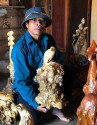 Những gốc cà phê nhiều năm tuổi tưởng như bỏ đi đã được trưởng bản tạo tác thành các sản phẩm như con vật, bình hoa, tượng… Điều này đem lại lợi nhuận kinh tế cho ông và bà con sống trên nương rẫy cao nguyên Di Linh (Lâm Đồng).