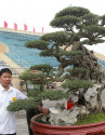 Tại triển lãm Sinh vật cảnh thị xã Sơn Tây (Hà Nội) mở rộng năm 2019, cây sanh cổ “ôm” đá có dáng uốn lượn từ trên xuống dưới như một dòng thác khiến nhiều người tò mò.