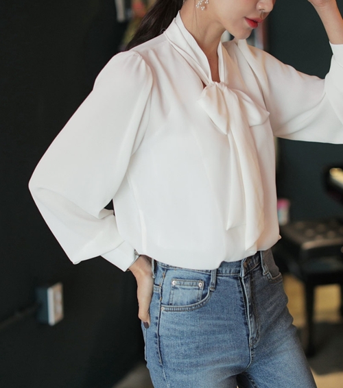 Sơ mi trắng điệu đà không hề khó mặc đi làm một khi bạn kết hợp với quần jeans màu xanh cổ điển.