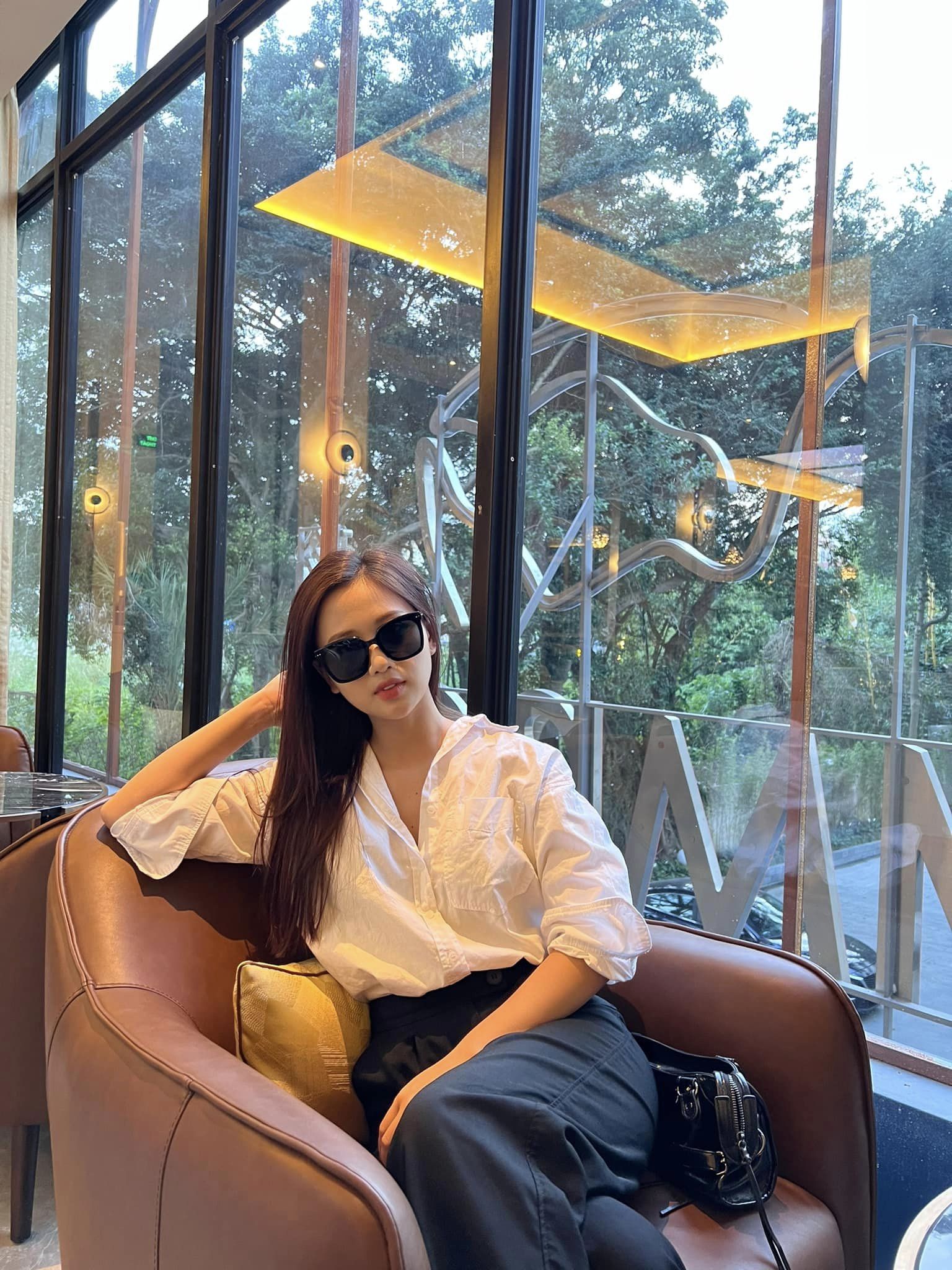 Trang phục của Thu Hương có tông màu nền nã, chuẩn phong cách minimalism.