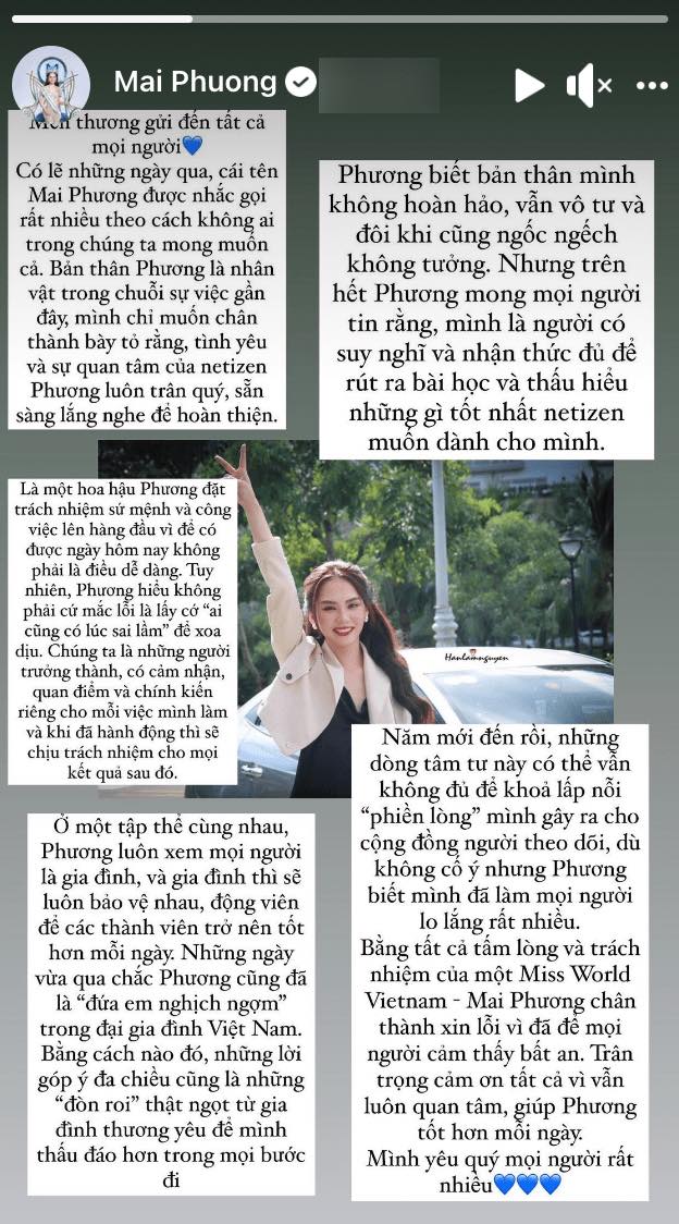Sau nhiều ngày ồn ào, mới đây, Mai Phương tiếp tục có động thái gây chú ý. Cô đã đăng tải dòng xin lỗi trên trang story cá nhân của mình. Đồng thời, cô nhấn mạnh, mình vẫn còn là "đứa em nghịch ngợm", thậm chí có đôi lúc vô tư, ngốc nghếch để biện minh. Song, sự việc này cũng không khiến công chúng hài lòng bởi "không đủ thành ý" vì dòng trạng thái này chỉ hiển thị trong vòng 24 giờ.