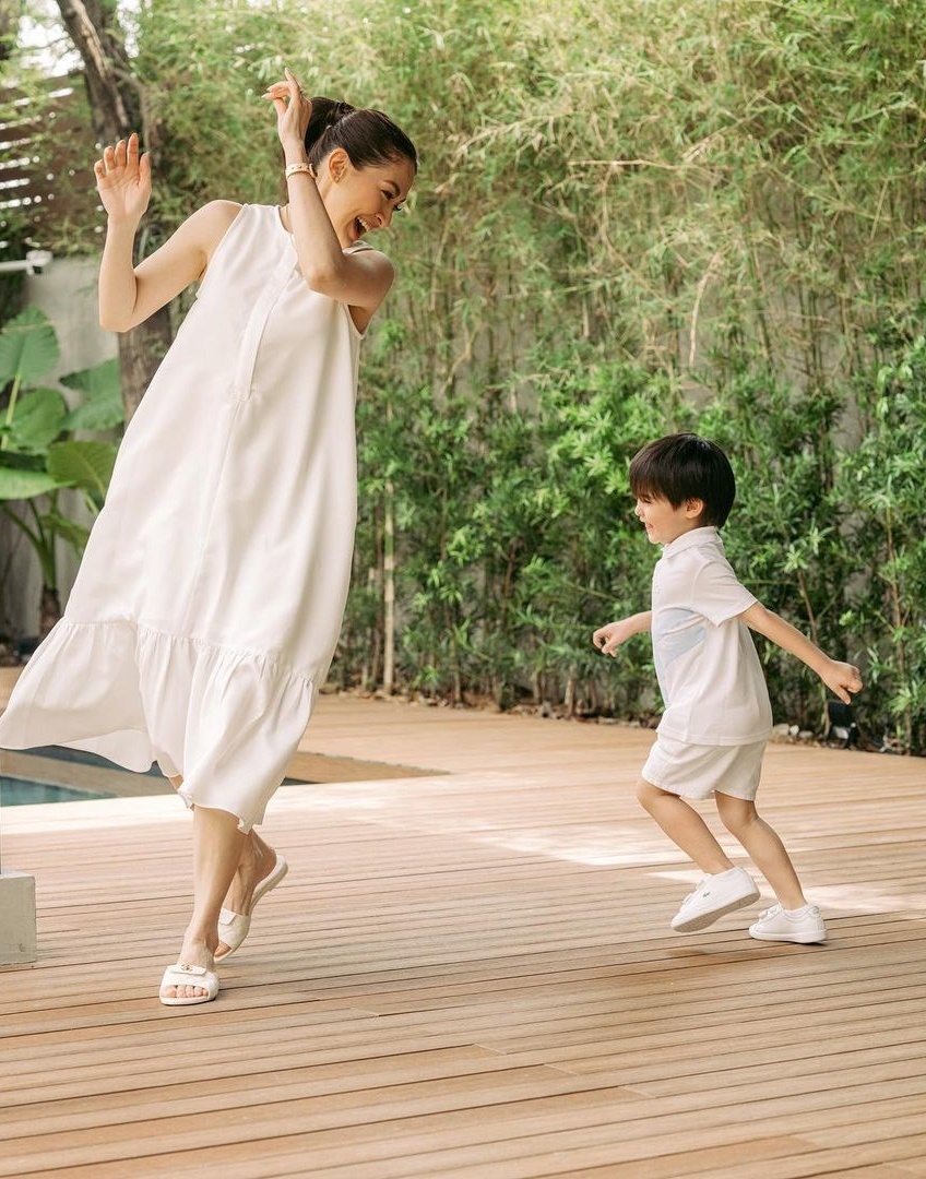 Marian thường chọn trang phục khá rộng rãi, thoải mái để mặc ở nhà và vui chơi cùng các con.