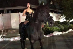 Cô gái trẻ mặc quần sooc, áo 2 dây cưỡi ngựa trên phố, thu hút mọi ánh nhìn của người đi đường.