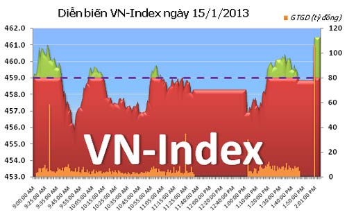 Kết thúc phiên giao dịch ngày 15/1, VN-Index tăng 2,45 điểm (+0,53%), lên 461,42 điểm. Tổng khối lượng giao dịch đạt 88,78 triệu đơn vị, tương đương giá trị 1.171,71 tỷ đồng. Trong đó, giao dịch thỏa thuận đạt 3,59 triệu đơn vị, trị giá 110,39 tỷ đồng.