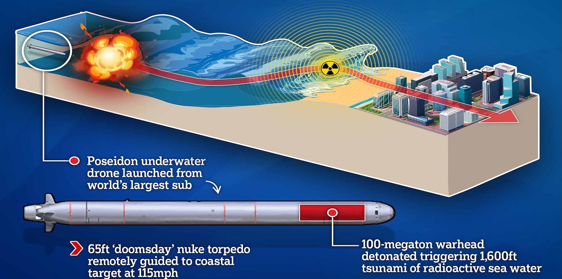 Tuy không thể tạo ra “sóng thần hạt nhân”, nhưng sức tàn phá của Poseidon, nếu được kích nổ gần một thành phố lớn, vẫn là thảm họa không thể tưởng tượng nổi, theo báo Nga.