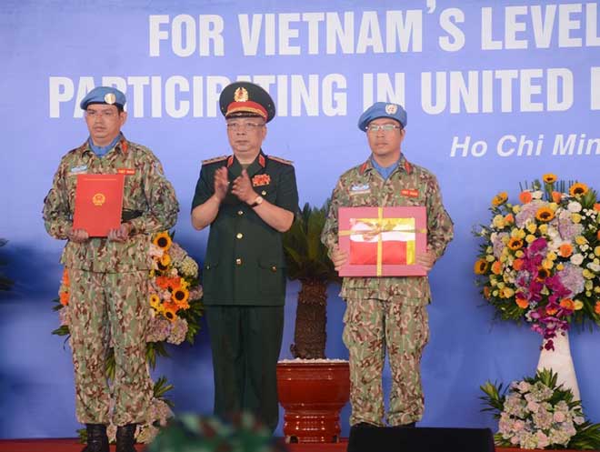 Đại diện BVDCC 2.1 nhận quyết định của Chủ tịch nước cử tham gia hoạt động gìn giữ hòa bình tại Phái bộ Nam Sudan do Thượng tướng Nguyễn Chí Vịnh trao. Ảnh: HL