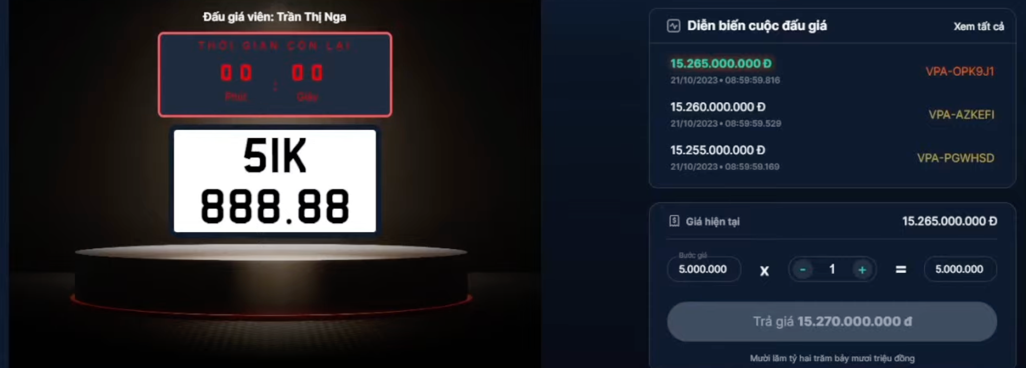 Sau 60 phút đưa ra đấu giá lại, biển số TP Hồ Chí Minh 51K – 888.88 đã được chốt với mức giá chưa bằng một nửa so với mức giá ở phiên đầu tiên.