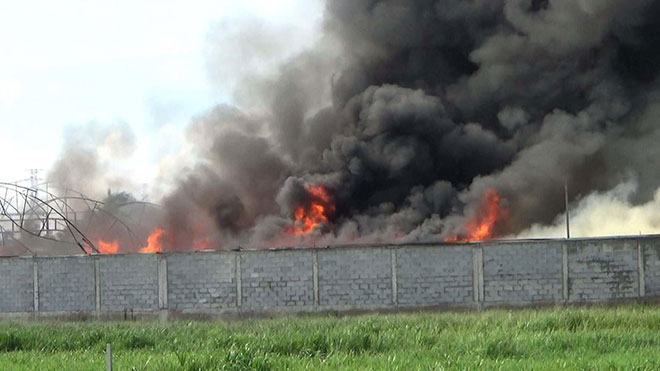Ngọn lửa bùng cháy dữ dội kèm theo khói đen bốc lên cuồn cuộn tại kho chứa nệm mút ở ngoại ô Sài Gòn, cảnh sát chữa cháy phải đập tường để xịt nước vào bên trong.