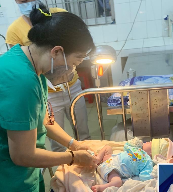 Bé trai nặng hơn 3kg được đặt trong bao đựng gạo màu xanh...
