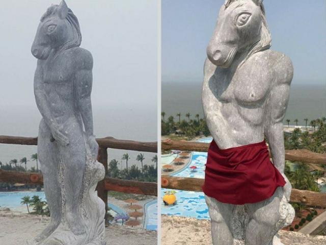 Sau khi được mặc quần bơi, có những tượng trong 12 con giáp khỏa thân ở khu du lịch Hòn Dấu (Hải Phòng) như đang đút tay...