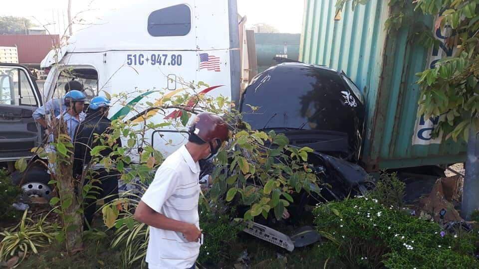 Theo thông tin ban đầu, chiếc container bất ngờ bị nổ lốp lúc chạy tốc độ cao, tài xế 4 chỗ đã phát hiện sự việc...