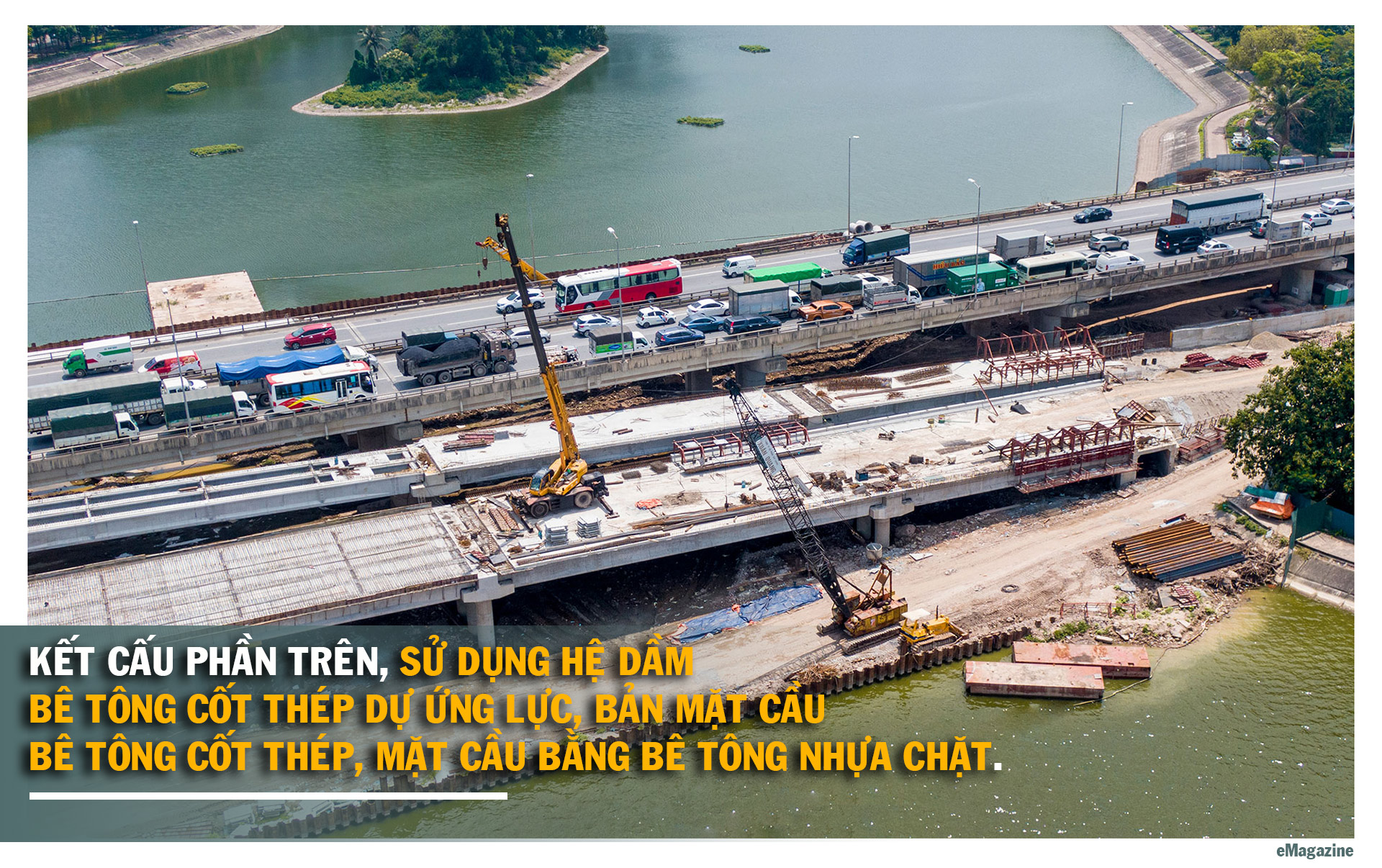 Trong đó, cây cầu này có tổng chiều dài trên 500m, trong đó, cầu bên trái dài gần 260m, cầu bên phải có chiều dài 282m. Chiều rộng mỗi cầu 13 m. Kết cấu phần trên, sử dụng hệ dầm bê tông cốt thép dự ứng lực, bản mặt cầu bê tông cốt thép, mặt cầu bằng bê tông nhựa chặt.