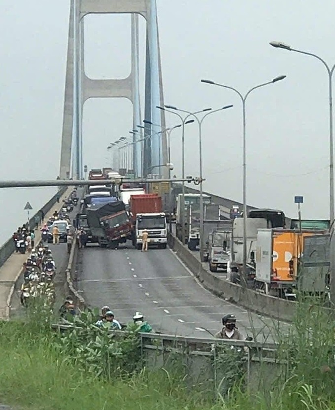 Tai nạn khiến khu vực cầu Phú Mỹ kẹt xe kéo dài. Ảnh: Đình Văn