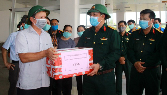Ông Lê Trường Lưu (áo trắng) đi thăm và tặng quà đội ngũ làm công tác hậu cần khu cách ly ở Thừa Thiên - Huế