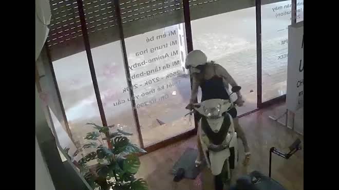 Rất may mắn, người phụ nữ này đã bình tĩnh, nhích chiếc xe ga lên phía trước, để cửa cuốn đóng sập ra phía sau và thoát khỏi tình huống nguy hiểm trong gang tấc.